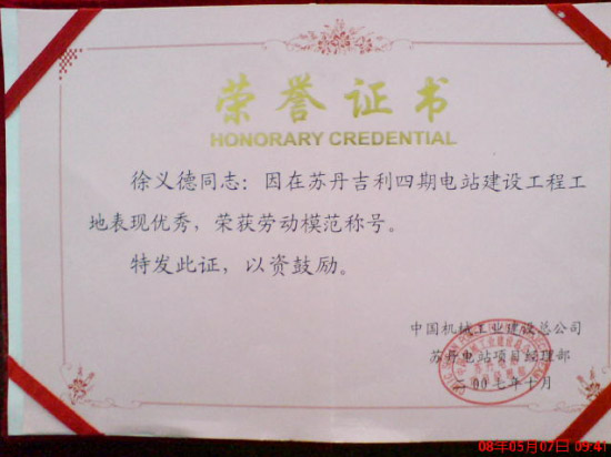 中昇建机工程师徐义德荣获苏丹吉利电厂四期工程2007年度劳动模范称号