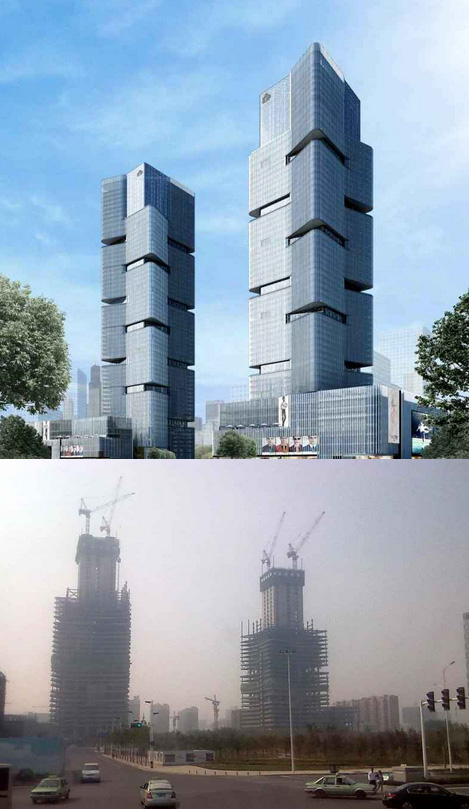 施工高度323米,采用中昇建机ZSL500两台(最大吊重32t)