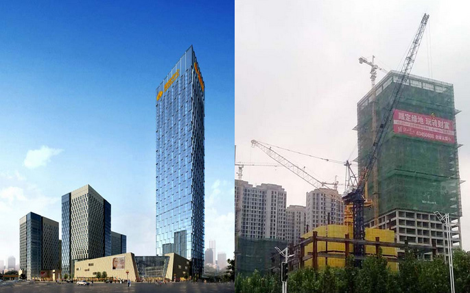 大楼高度208米,采用中昇建机ZSL1000一台(最大吊重64t)和ZSL750一台(最大吊重50t)。